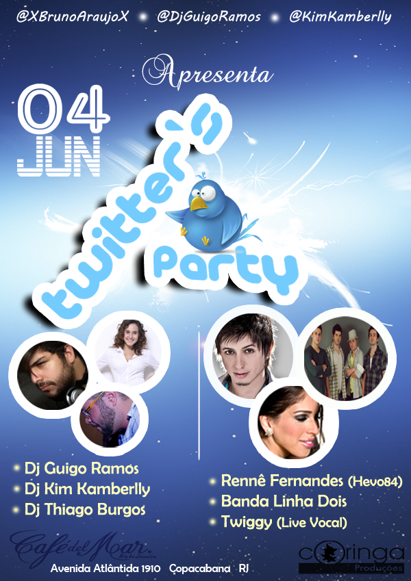 Acontece no próximo sábado (04) a segunda edição da “Twitter’s Party”, no Rio de Janeiro. Os organizadores Guigo Ramos, Kim Kamberlly e Bruno Araujo traz nessa edição um conceito beneficente direcionando 50% da bilheteria para Fundação Xuxa Meneghel.