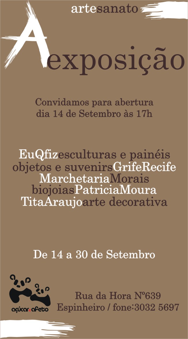 A mostra acontece entre os dias 14 e 30 de setembro, na loja Açúcar e Afeto e conta com o grande encontro das marcas EuQFiz, Grife Recife, Marchetaria Morais, Tita Araújo e Patrícia Moura BioJóias.