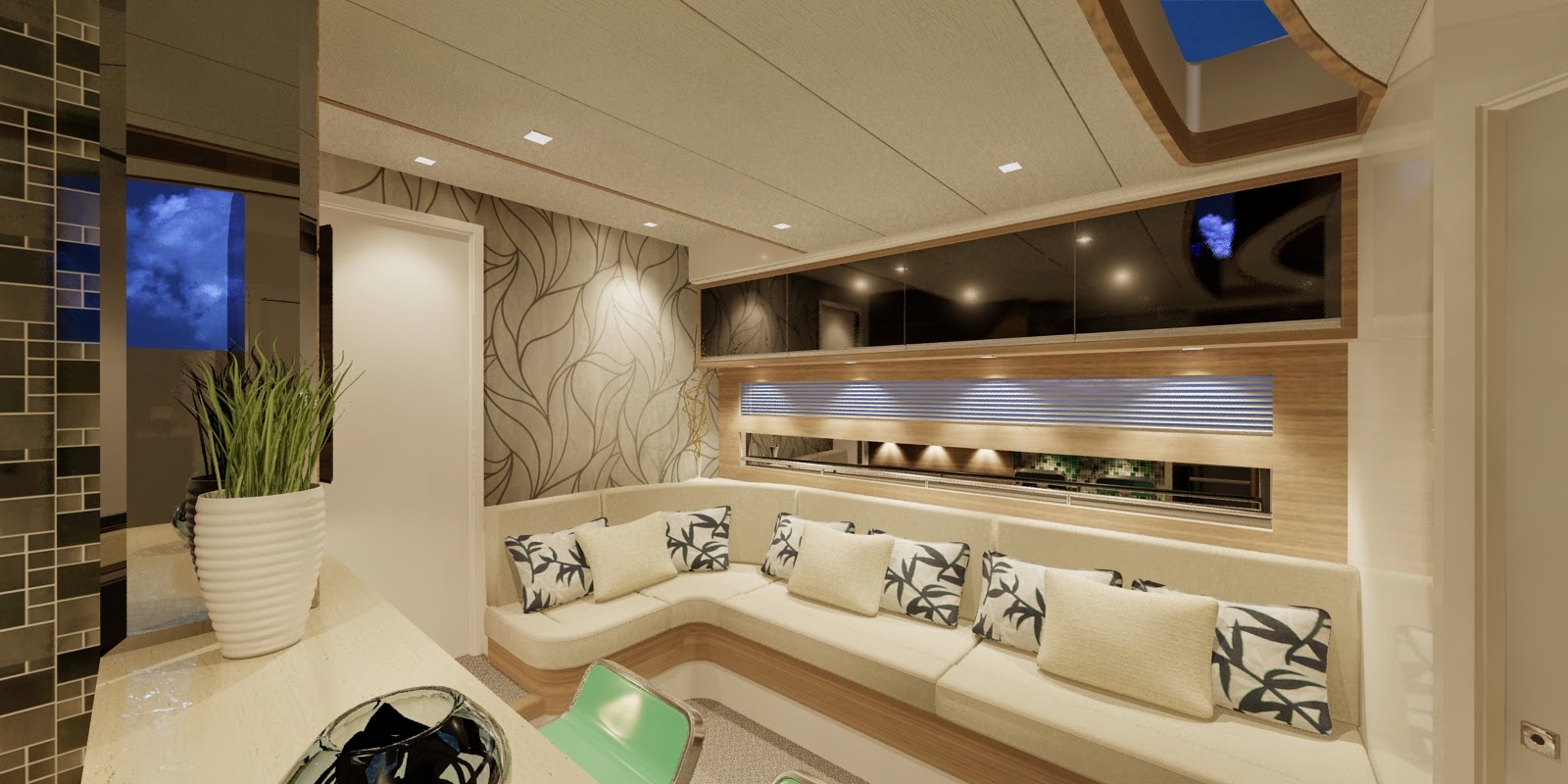 Mayckon Roberto Cunha, engenheiro e arquiteto responsável pelos projetos da Ecomariner, explica que uma boa e moderna decoração faz toda a diferença, principalmente quando o barco possui vários ambientes. Segundo ele, o proprietário do bem deve escolher o décor pensando na praticidade do dia a dia. “Cada cliente define a decoração do seu barco ainda na etapa de construção, pois o objetivo é colocar eletrodomésticos, estofados, paredes, pisos e ainda enxoval de cama, mesa e banho, de acordo com o estilo de vida da família” explica, ressaltando que o modelo 600 Open, o qual está trabalhando, é composto de duas suítes, uma cabine com cama de solteiro e um banheiro independente, além de cozinha e sala integradas. O traço simples e conceito minimalista foram usados para ilustrar a ambientação da nova embarcação, assim como móveis sob medida e tonalidades claras que convivem em harmonia com revestimentos com cores e texturas similares à madeira natural.