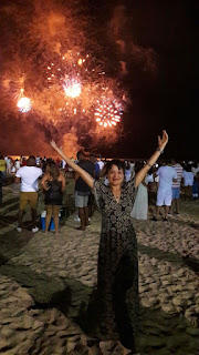 Bom, disseram que seriam 15 minutos de fogos na praia de Boa Viagem e do Pina, pegamos o UBER faltando 15 min pra virada do ano e não deu tempo de chegar em BV, descemos alí no Pólo Pina mesmo e priu. A tristeza foi ver os fogos maravilhosos de Boa Viagem e comparar com os do “Pinoso”, mas deu para o gasto e pra tirar foto, foi a primeira virada de ano de Cláudia Rebêlo em Boa Viagem… ops, Pina. Uia. Lavamos os pés na água contaminada de xixi e fizemos nossos agradecimentos a Yemanjá.